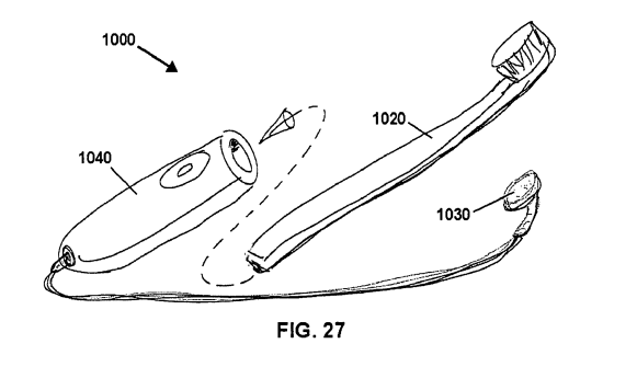 Of course, music tech innovation doesn’t always reach for the stars. Sometimes it just wants to help you with everyday activities … like making sure your children have brushed their teeth properly. Colgate-Palmolive’s patent “Musical Toothbrush” (US7418757) sets out to solve just this problem by describing a toothbrush with “an output for transmitting or playing … stored audio signals”. As shown in the patent image below, the toothbrush’s “output” could take the form of an earpiece to listen to audio stored in the main body. According to the patent this creates