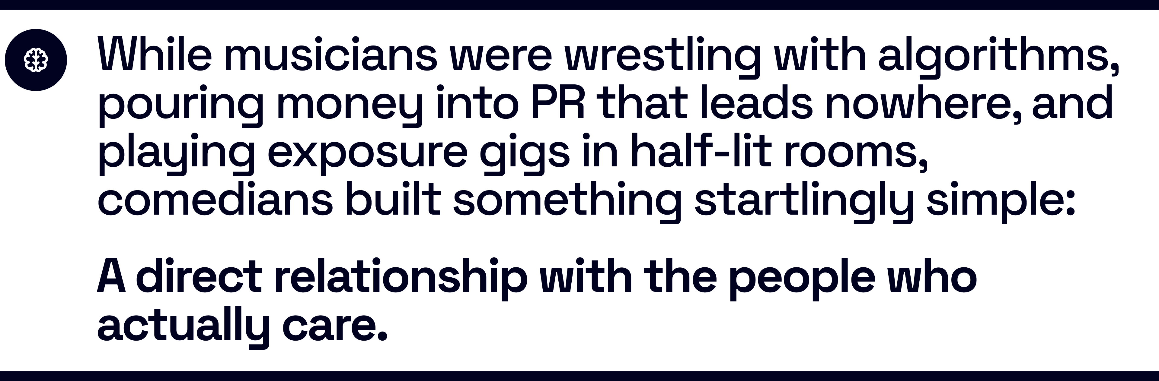 A comedian with a couple thousand loyal fans can fill a room anywhere in the country. No playlist needed. No algorithmic blessing. No label meeting. They decide the time, the place and routine.